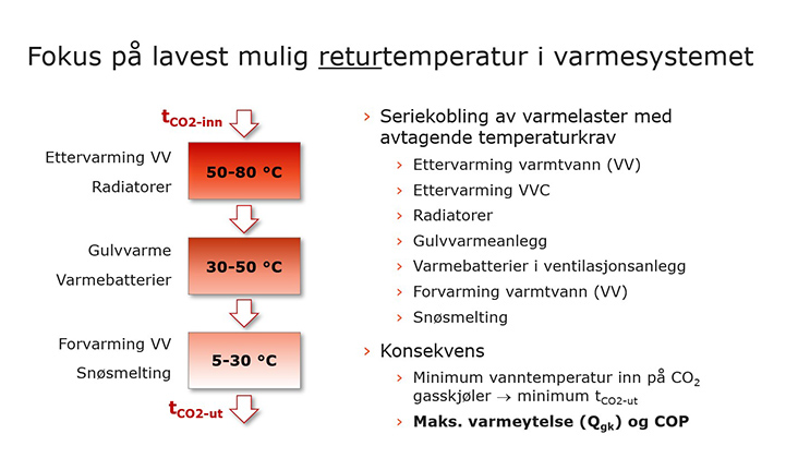 – Hvis derimot CO₂-varmepumpen leverer varme til et varmesystem der gjennomsnittlig returtemperatur er relativt høy, f.eks. 40-45 °C, vil ikke CO₂-gassen avkjøles så mye, slik at avgitt varmeytelse (kW) og SCOP blir relativt lav, sier Stene.