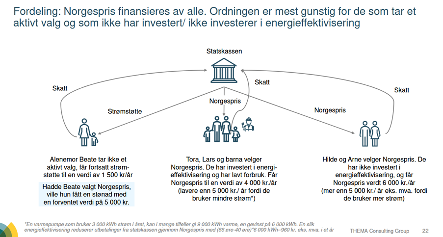 Ifølge THEMA er regjeringens forslag om "Norgespris" det dyreste og dårligste alternativet på sikt. Hovedårsaken er at modellen kraftig svekker insentivene for energieffektivisering.