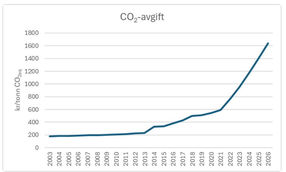 CO₂-avgift fra 2003 til 2026. Kilde: VKE