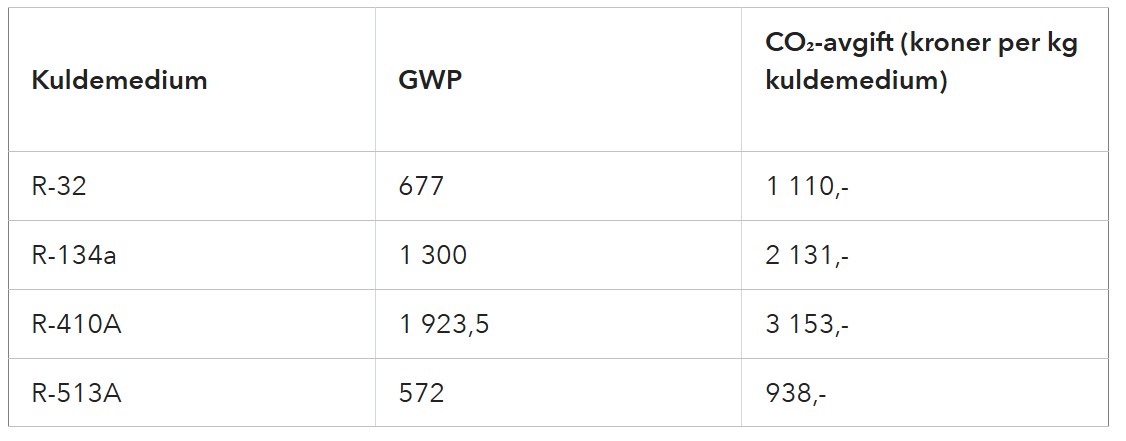 Tabellen under viser noen kuldemedier med GWP og størrelsen på CO₂-avgift fra 1. januar 2025.