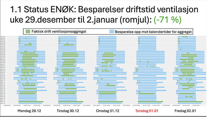 – Så kommer romjulen, og det er stille og rolig, og det er gjerne ikke så mange kollegaer på jobb. Det vi så i disse byggene i Oslo, var at vi i denne perioden reduserte driftstiden med nesten 71 prosent sammenlignet med det som var ført opp i kalenderen, sa Hagenes.