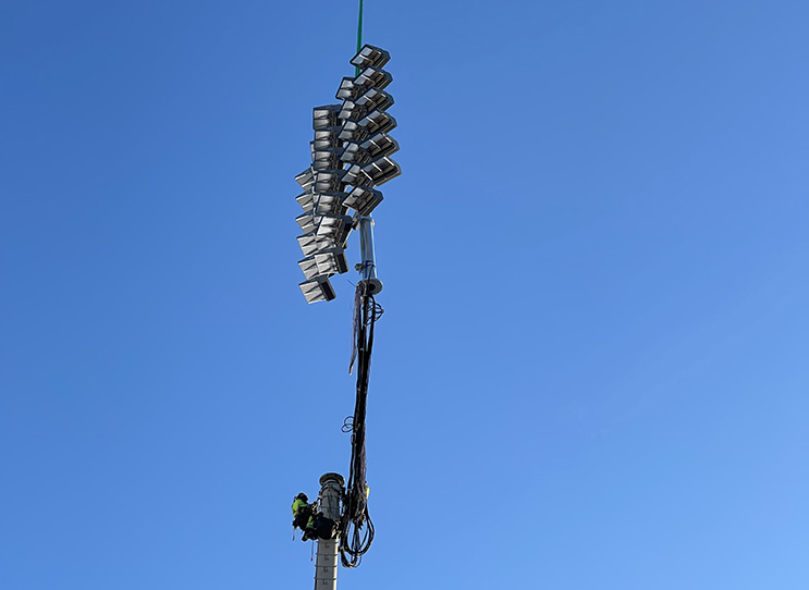 Belysningen over tribunen er allerede erstattet med nye LED-armaturer. Akkurat nå installerer prosjektet nye armaturer på de nærmere 40 meter høye mastene som står utenfor stadion. Matetoppene, som veier rundt 1,5 tonn og bærer 20-30 lyskastere, løftes ned og opp av en mobilkran mens fasadeklatrere hjelper til med å dirigere dem på plass.