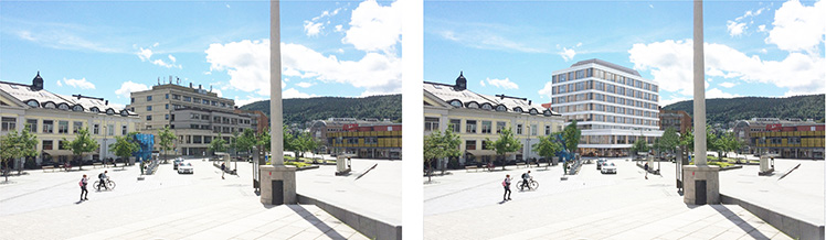 Et viktig arkitektonisk grep var å rive påbygget fra 1996, som brøt med byggets opprinnelige proporsjoner. Dermed kunne bygningen tilbakeføres til hovedkomposisjonen fra 1974, samtidig som den ble utvidet med to nye etasjer og et teknisk rom. Resultatet er en tydeligere arkitektonisk helhet, en lavere og mer åpen gatefasade mot torget, og en fasade som gjenskaper det opprinnelige uttrykket.
