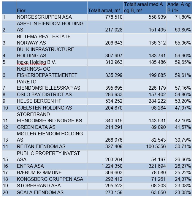 Analysen omfatter eiendomsporteføljer med over 200 000 kvadratmeter næringsbygg. Metoden tar utgangspunkt i andelen av totalt bruksareal (BRA) med energikarakter A og B.