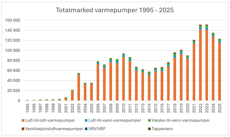 Totalmarkedet for varmepumper falt med 9 prosent i 2025 sammenlignet med 2024. Det ble totalt solgt 123 012 varmepumper i 2025, mot 135 023 i 2024 og 151 506 i 2023.