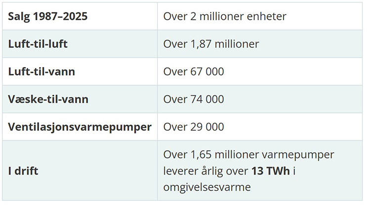 Siden Norsk Varmepumpeforening startet innsamlingen av salgstall tidlig på 90-tallet, har varmepumper gått fra å være et nisjeprodukt til å bli allemannseie. I løpet av 2025 passerte vi to millioner solgte varmepumper i Norge. Av disse er 1,65 millioner i drift ved utgangen av 2025. Utviklingen illustrerer hvilken betydning varmepumper har for det norske energisystemet.
