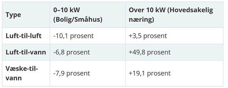 - Luft-til-luft: Boligsegmentet (0–10 kW) falt med 10,1 prosent, mens større anlegg over 10 kW steg med 3,5 prosent. Kategorien 21–50 kW utmerker seg med over 30 prosent vekst.