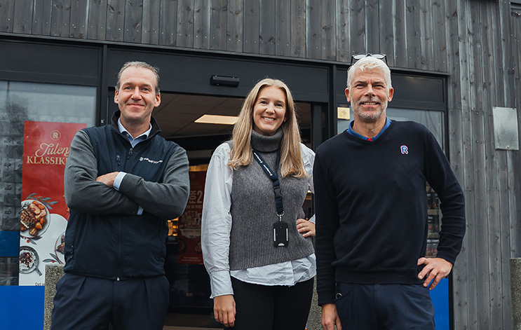 Kjøpmann Thor Fredrik Borgersen (t.h.) ved REMA 1000 Siljan var først ut til å få sol på taket. Her sammen med Rikard af Ekenstam og Siri Bjørnstad Jensen fra Sunday Power. Foto: André Hofland