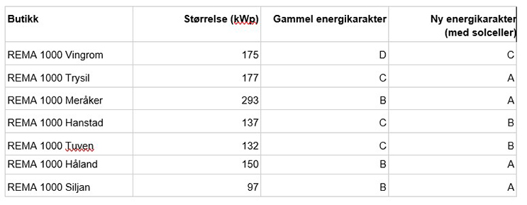 Tabell: Fase 1 solceller REMA1000 / Ragde Eiendom
