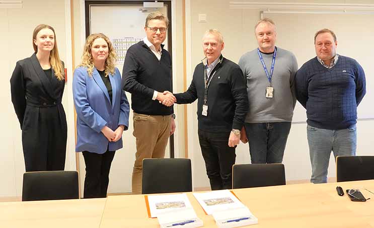 Kontraktsignering: Teamet fra Schneider Electric (til venstre) poserer sammen med teamet fra Helse Sør-Øst. Fra venstre: Aurelie Marcon, VP Digital Energy Nordic Baltic; Sandra Lissdaniels, End User Sales; Petter Moseby, direktør i Digital Energy i Schneider Electric; Karl Otto Jansen, prosjektdirektør Nye Aker samt Jan Rune Martinsen, Områdeleder U4 og Roger Herheim, prosjektleder fra Sykehusbygg. Foto: Schneider Electric.