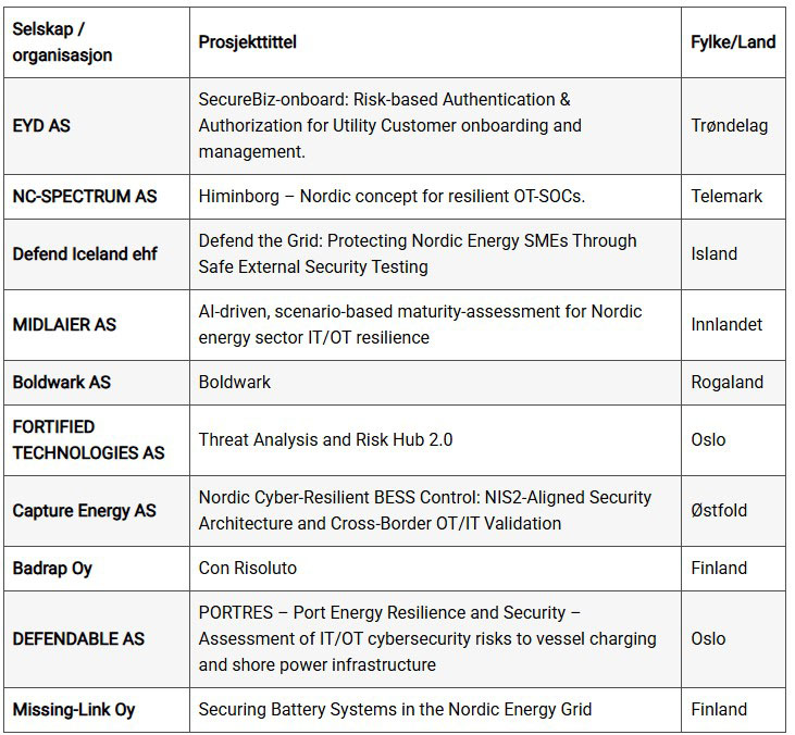 Til sammen ti prosjekter i Norge, Finland og Island mottar støtte. Prosjektene representerer ulike deler av kraftsektoren og tar for seg sentrale risikoer innen både IT og operasjonell teknologi (OT).