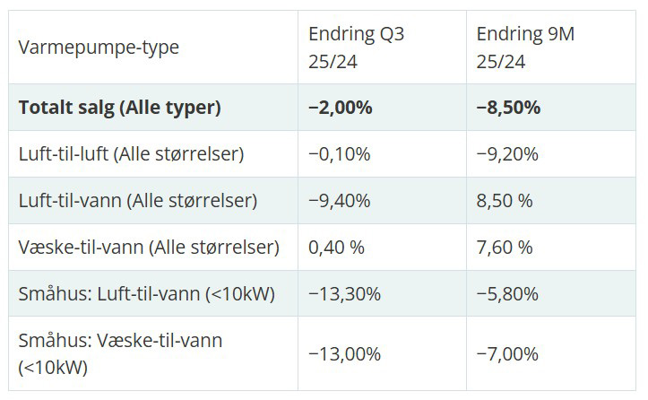 - Salget av luft-til-vann-varmepumper under 10 kW falt med −13,3% i Q3, og ligger −5,8% bak fjoråret kumulativt.