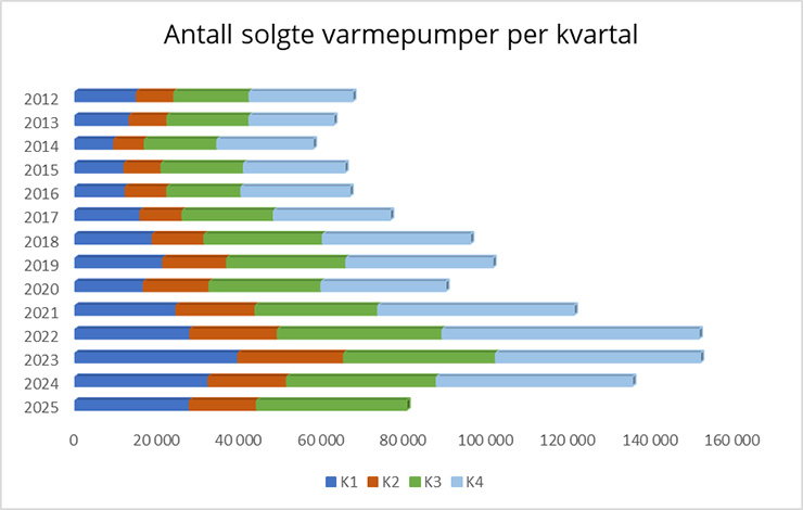 Etter to år med salgsrekorder i 2022 og 2023 som følge av rekordhøye strømpriser, har den svært gunstige strømstøtten og lavere strømpriser for husholdningene bidratt til at etterspørselen etter varmepumper har falt. Det er kun salget til næring som viser vekst, da disse fortsatt betaler markedspris for strømmen. Usikkerhet knyttet til politisk styrte fastpriser, som «Norgespris», har også bidratt til at mange husholdninger har avventet med å investere i varmepumper.